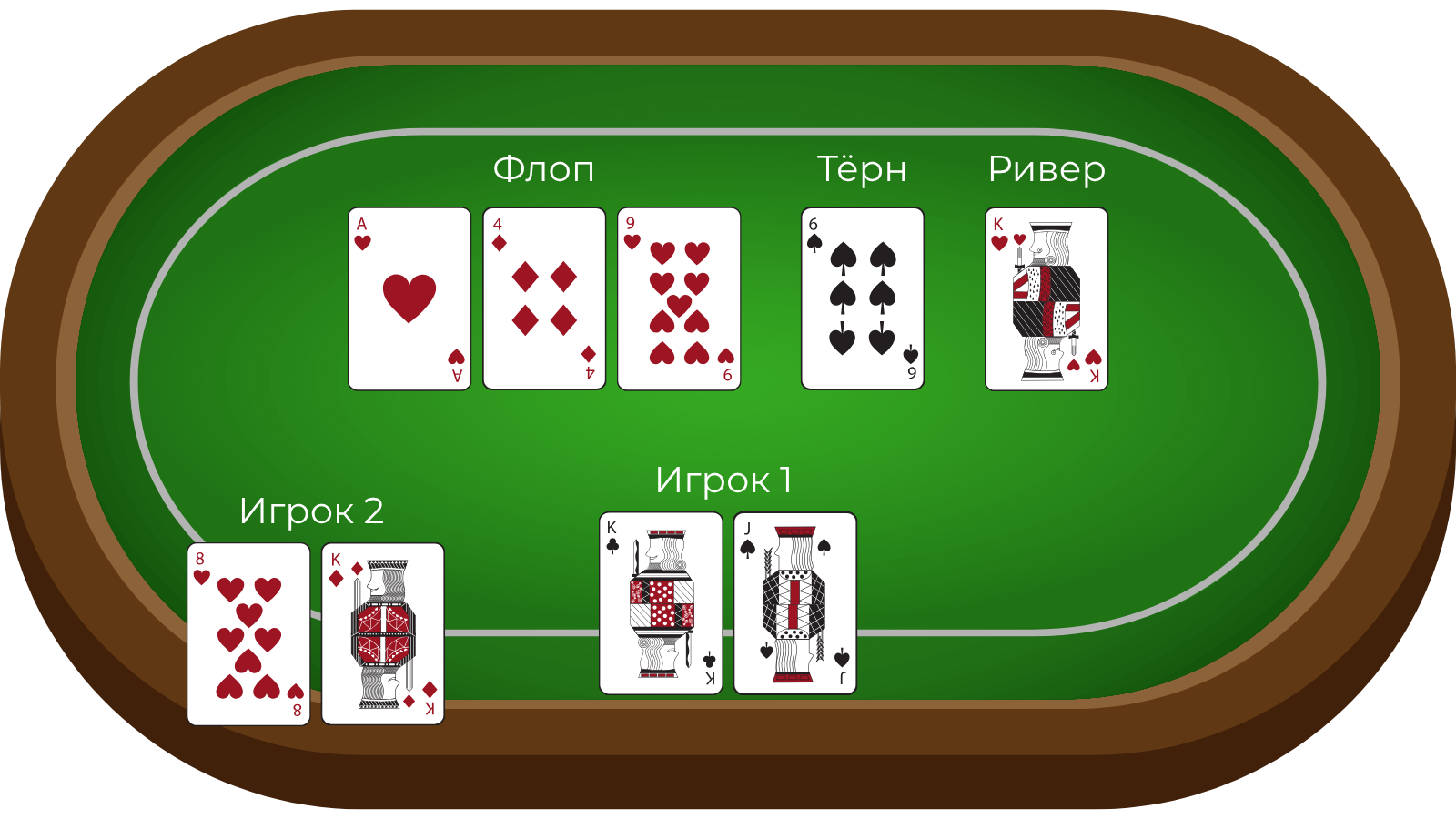 Если у игроков равные сочетания, сравниваются «свободные» карты — выигрывает старший кикер.